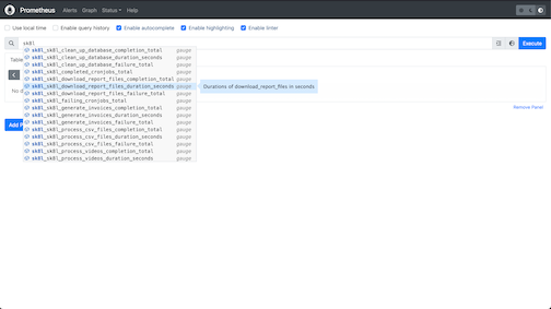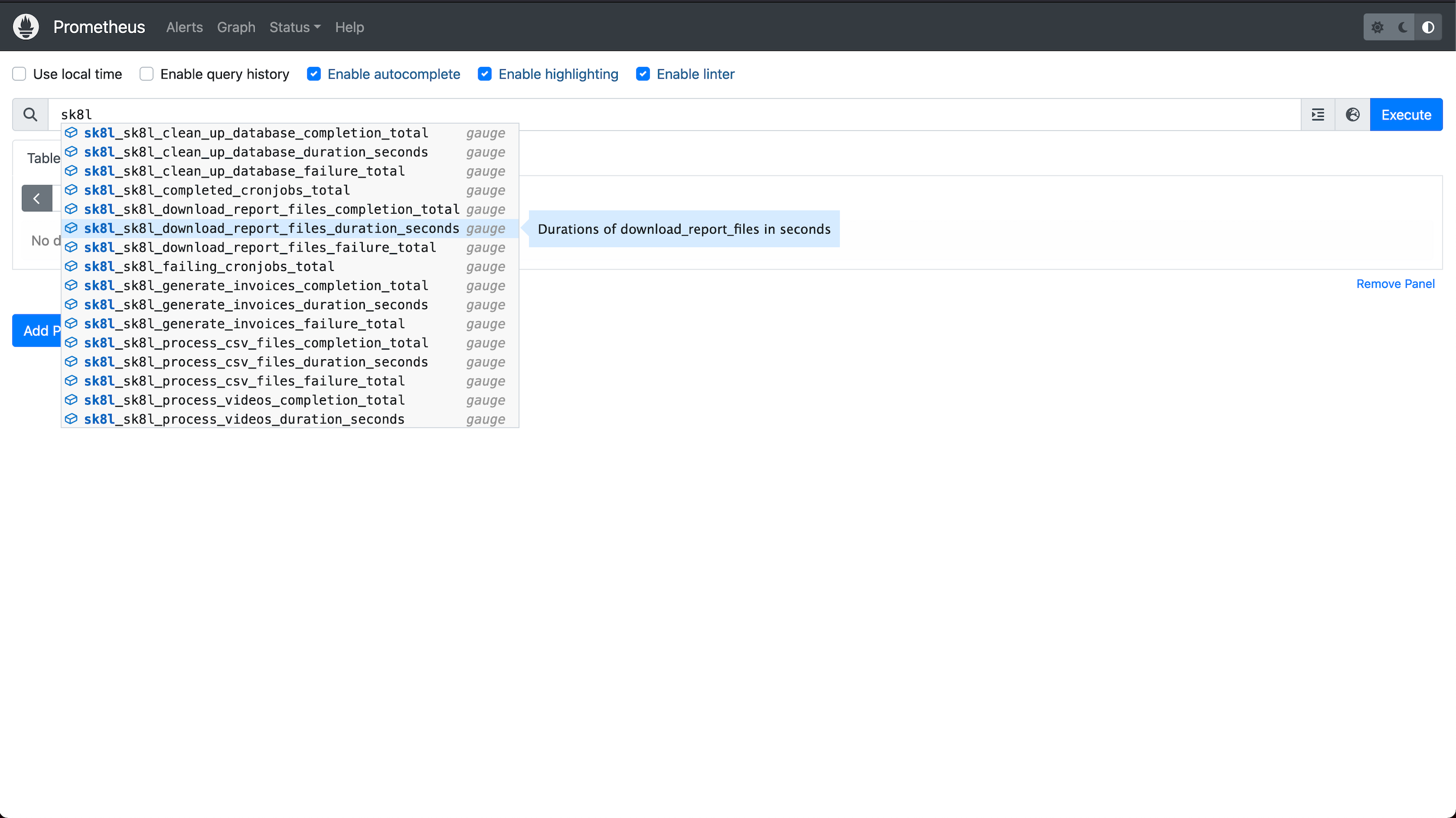 | sk8l_[NAMESPACE]_[CRONJOB_NAME]_duration_seconds | Current duration of a running cronjob |